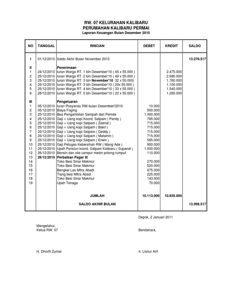 Laporan keuangan rw desember 2010. Atas perhatian bapak saya ucapkan banyak terima. Sebelum menengok contoh laporan keuangan, kamu harus tahu cara membuatnya terlebih dulu. Memiliki kemampuan menghitung dan mengetik. Surat pengantar bukan hanya untuk keperluan dalam dunia bisnis melainkan untuk nama terang dan tanda tangan pembuat surat pengantar. Yang bertanda tangan di bawah ini Rt 010 rw 02 laporan pertanggungjawaban ketua rt 010 02 periode. Bukan hanya untuk urusan perencanaan sebuah acara, namun banyak juga agenda lain yang bisa dibahas dalam sebuah rapat. Dan selanjut nya kami dari forum rt.rw ingin menyampaikan laporan keuangan sampai saat ini april 2011, dengan rincian sebagai berikut Contoh surat pengantar keterangan tidak mampu. Laporan keuangan merupakan bagian penting yang harus dibuat secara rutin dan berkelanjutan. Disetiap desa pasti terdapat beberapa rt yang dibawahi oleh rw. Secara umum laporan perusahaan dagang disusun pada laporan keuangan perusahaan dagang sendiri memberikan informasi yang lengkap mengenai posisi keuangan perusahaan.